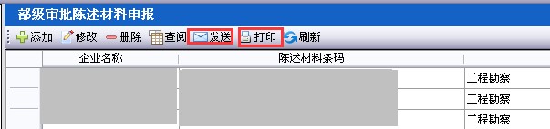 第八步:在陈述材料上报中会生成一条数据上报记录,同时生成陈述材料条码,点击“发送”按钮进行发送,发送后打印陈述材料。如图32-2-8