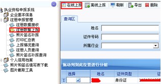 2、点击“注册申报管理—注册数据上报”,在人员列表中选择导入的数据,点击菜单栏“在线上报”,系统提示上报成功,即带有照片签名的初始申请上报成功,如图10-1-2: