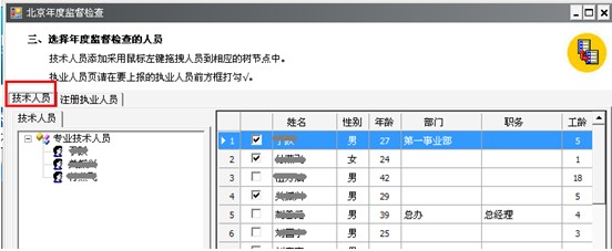 6、点击“下一步”在第三项“选择年度监督检查人员”中拖选技术人员到相应树节点中(如图20-81),并在所需上报执业信息前打“√”(如图20-82):