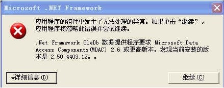 错误提示:Message: .Net Framework 数据提供程序要求 Microsoft Data Access Components(MDAC)。请安装 Microsoft Data Access Components(MDAC) 2.6 或更高版本。如下图所示